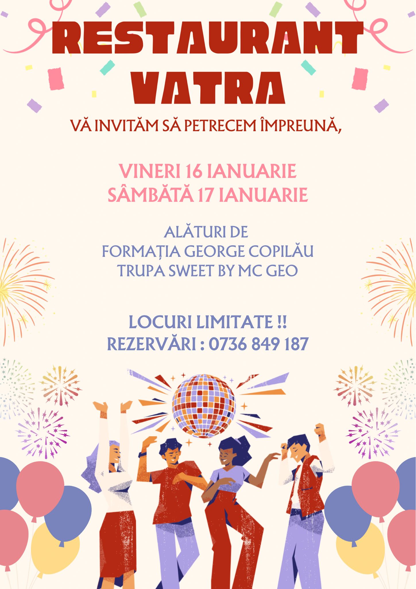 Cu un ambient plăcut, decor elegant, cu un sistem de ventilaţie, purificare a aerului şi aer condiţionat de ultimă generaţie: ,, Restaurantul Vatra” găzduieşte evenimente de la 300 -350 persoane interior – până la 500 persoane împreună cu terasa ce o înconjoară pe două laturi.